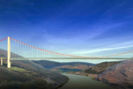 湖南張花高速澧水特大橋,為主跨858米的鋼桁梁懸索橋。...