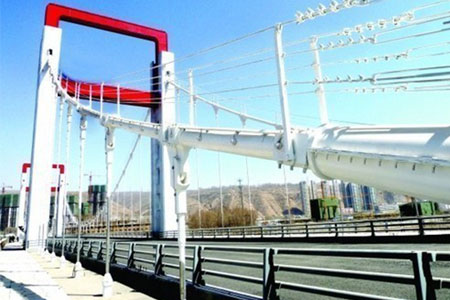 內蒙古綠林街大橋主橋為鋼筋混凝土懸索橋,主跨為90m,兩側邊跨為48.5 m。主...