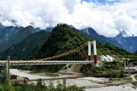 西藏靈芝通麥大橋是川藏公路318國道的咽喉工程,大橋設計為雙塔雙跨懸索橋,全長2...